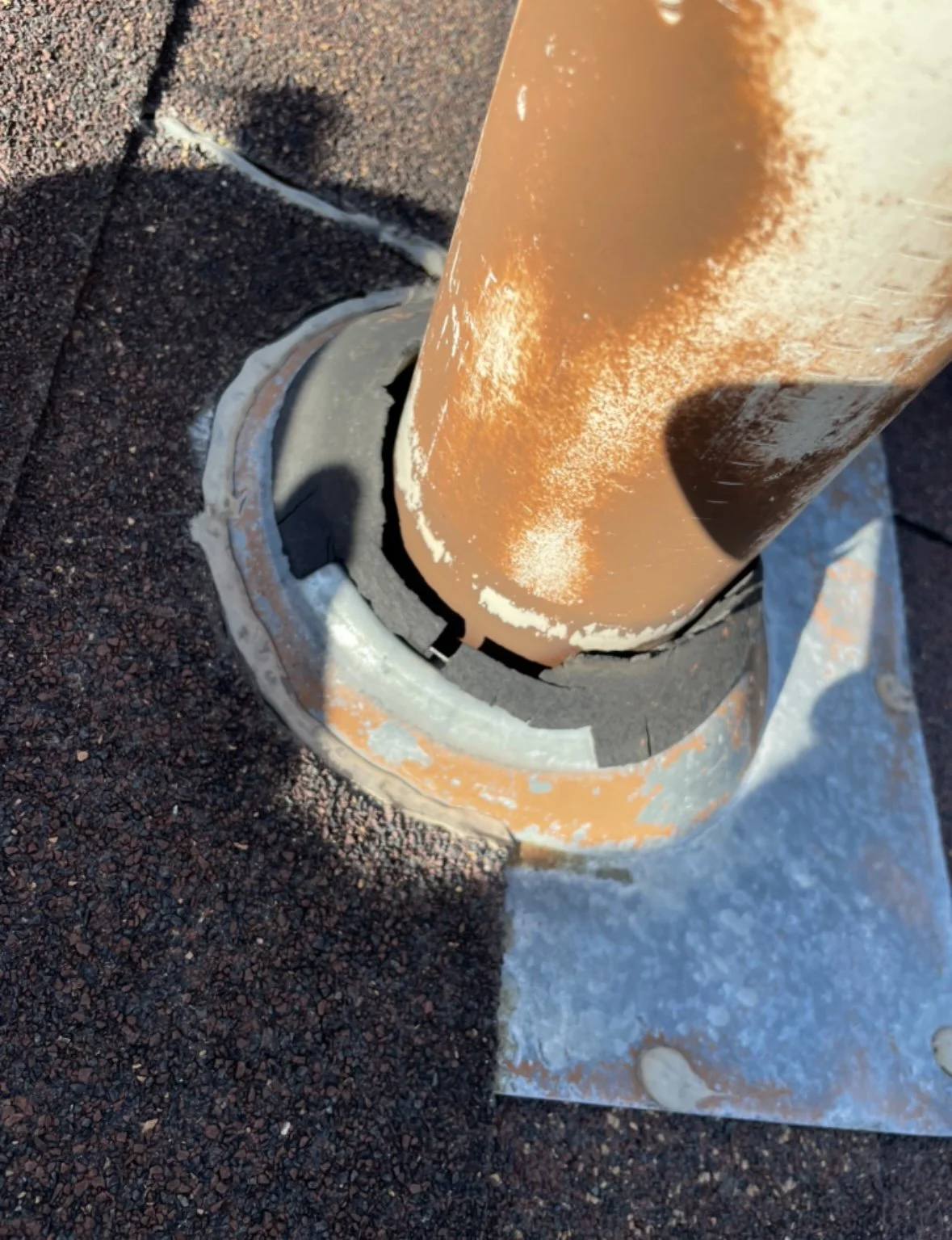 We inspect pipe jack collars for cracking and deterioration. These collars, fitted with rubber, are designed to seal against moisture intrusion. However, sun exposure causes the rubber to deteriorate over time, leading to cracks. When it rains, these cracks can allow water to penetrate the seal and enter your home. If this is the case on your property, these will need to be fixed to ensure proper protection against water damage.