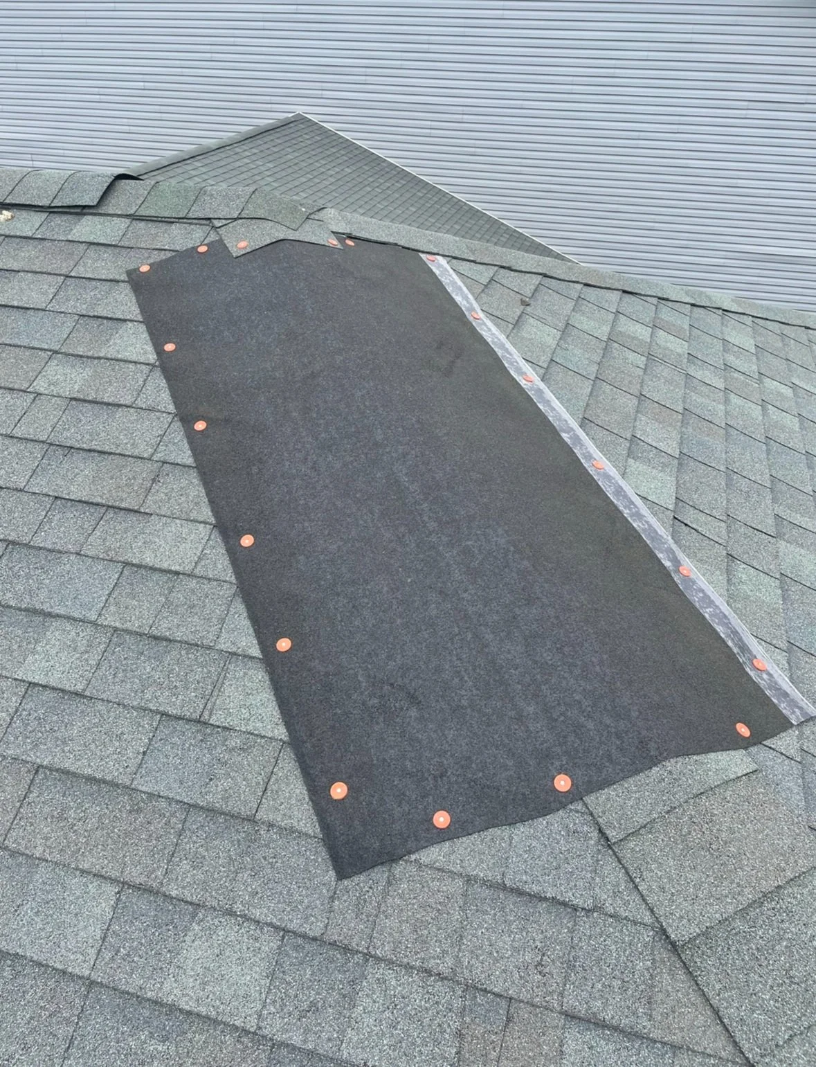 In this photo, a temporary repair is shown with Ice and Water shield tacked in place using nail caps. Temporary repairs are great for protecting your property from water intrusion. If you plan on having insurance come out, this method preserves the damaged area, allowing you to show the damage to the insurance while protecting your house in the meantime.